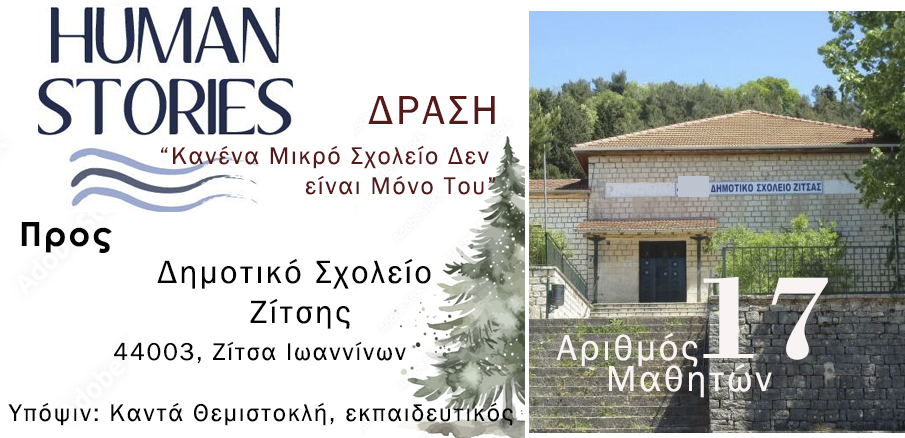 📬 ΔΗΜΟΤΙΚΟ ΣΧΟΛΕΙΟ ΖΙΤΖΗΣ ΙΩΑΝΝΙΝΩΝ, Τ.Κ. 44003 ΖΙΤΣΑ, Τηλέφωνο: 2658022270 Υπόψιν: Καντά Θεμιστοκλή, Εκπαιδευτικός. Μαθητές:17
